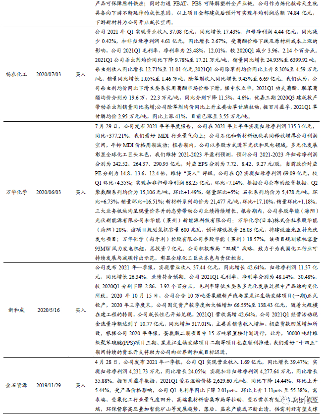 华鲁恒升:根据百川盈孚数据,目前华鲁恒升拥有碳酸二甲酯产能2万吨/年,预计2021年将新增30万吨碳酸二甲酯新产能。随着公司新增DMC产能投放,未来公司DMC产能有望达到32万吨/年,规模优势凸显,成本有望大幅降低。随着未来电动汽车及移动设备渗透率的不断提高,锂电池需求将不断增长, DMC作为主要的电解液溶剂,市场空间广阔。另外,根据化工在线,公司拟投资44.28亿元建设12万吨/年PBAT可降解塑料和17.95万吨BDO项目,包括建设年产1,4丁二醇BDO 17.95万吨, PBAT 12万吨;N-甲基吡咯烷酮(NMP) 5万吨等。根据苏州裕辰隆工程塑料有限公司,PVDF是一种非极性链装高分子粘结剂,已成功应用于锂电池行业中。其生产过程中需要N-甲基吡咯烷酮(NMP)作溶剂。公司积极布局锂电池上游新材料,符合国家新兴战略规划,具有较为明显的成本优势,随着公司进一步布局新材料相关产品,公司盈利水平有望持续提升。