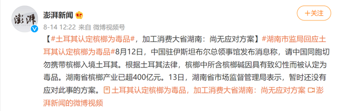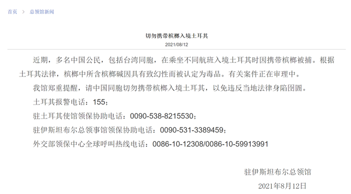 近日,中国驻伊斯坦布尔总领馆发文提醒:切勿携带槟榔入境土耳其。