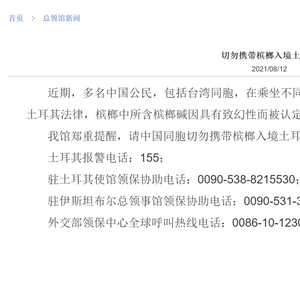 近期,多名中国公民,包括台湾同胞,在乘坐不同航班入境土耳其时因携带槟榔被捕。根据土耳其法律,槟榔中所含槟榔碱因具有致幻性而被认定为毒品。有关案件正在审理中。