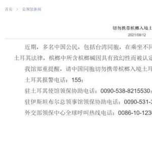 近日,中国驻伊斯坦布尔总领馆发文提醒:切勿携带槟榔入境土耳其。