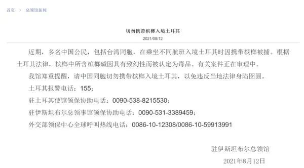 近期,多名中国公民,包括台湾同胞,在乘坐不同航班入境土耳其时因携带槟榔被捕。根据土耳其法律,槟榔中所含槟榔碱因具有致幻性而被认定为毒品。有关案件正在审理中。