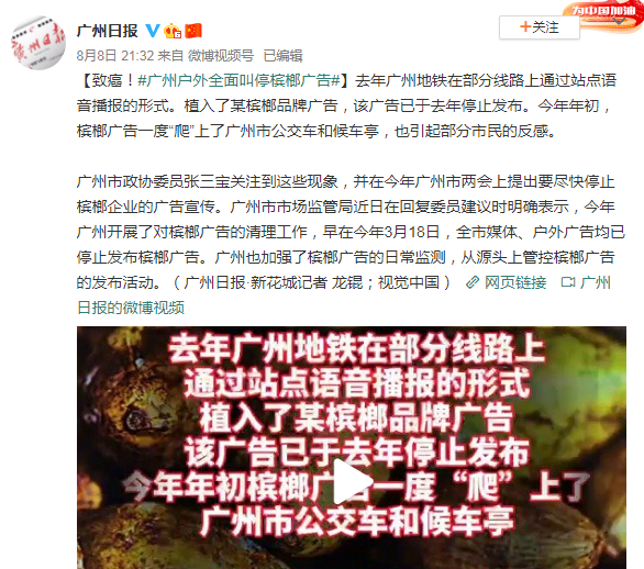 据广州日报,今年年初,槟榔广告一度“爬”上了广州市公交车和候车亭,引起部分市民的反感。广州市政协委员张三宝关注到这些现象,并在今年广州市两会上提出要尽快停止槟榔企业的广告宣传。广州市市场监管局近日在回复委员建议时明确表示,今年广州开展了对槟榔广告的清理工作,早在今年3月18日,全市媒体、户外广告均已停止发布槟榔广告。广州也加强了槟榔广告的日常监测,从源头上管控槟榔广告的发布活动。