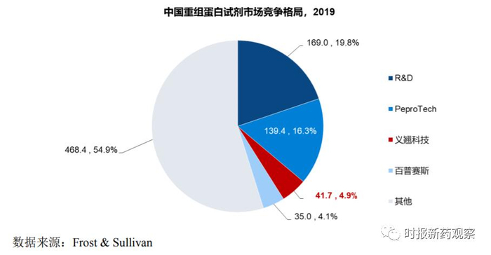 根据义翘神州的招股书,IVD诊断试剂成本的60%-80%是包括诊断酶、抗原和抗体在内的诊断试剂原料,其中的诊断酶和抗原中的一部分就是重组蛋白。义翘神州研发了一系列核心技术平台,其中包括先进的抗原设计和抗原制备技术平台,能够提供“一站式”采购生物试剂产品及相关技术服务。在2019年中国重组蛋白试剂市场,义翘科技拥有4.9%的市场份额,在国产厂商中排第一,在所有厂商中排第三。
