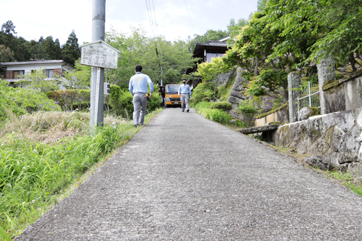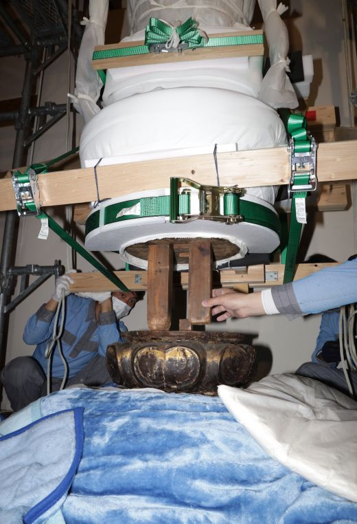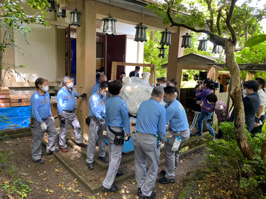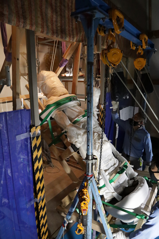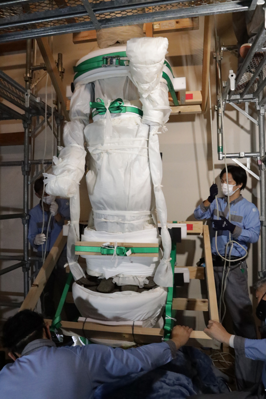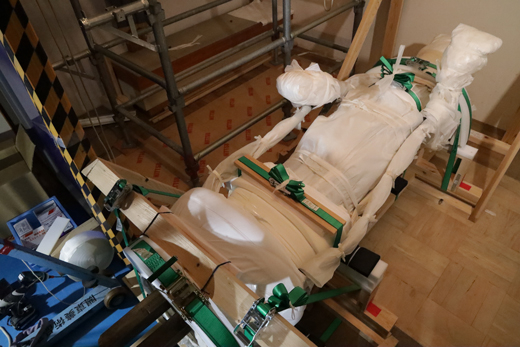 从佛堂穿过寺院到山门(寺院的入口)需要经过陡峭的台阶。按事先规划好的路线,以人工将大佛搬运到无顶棚的接驳小车,到达平地后,再搬上美术品专用车运往东京。