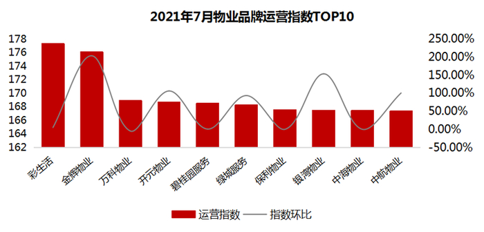 本月运营指数排名前十的依次是:彩生活、金辉物业、万科物业、开元物业、碧桂园服务、绿城服务、保利物业、银湾物业、中海物业和中航物业。其中,运营突出表现品牌为金辉物业,其运营指数达到176.07,环比上涨203.41%,排名位于运营指数第2位。