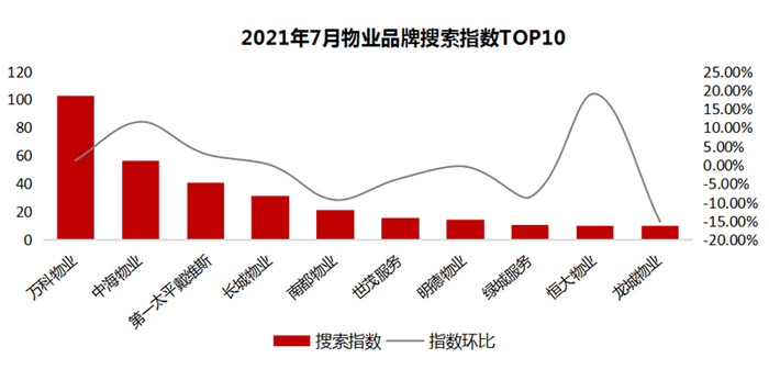 本月搜索指数排名前十的品牌依次是:万科物业、中海物业、第一太平戴维斯、长城物业、南都物业、世茂服务、明德物业、绿城服务、恒大物业、龙城物业。其中,值得重点关注的是恒大物业,本月搜索指数环比上升19%,达到10.27,位于搜索指数排名9位。