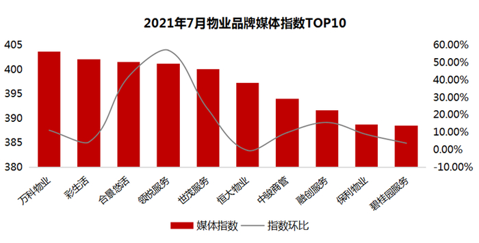 7月媒体指数排名前十的依次是:万科物业、彩生活、合景悠活、领悦服务、世茂服务、恒大物业、中骏商管、融创服务、保利物业和碧桂园服务。其中,媒体指数重点关注品牌为领悦服务,其媒体指数达到401.15,环比上升56.99%,排名位于媒体指数第4位,物业品牌影响力榜单第20名。