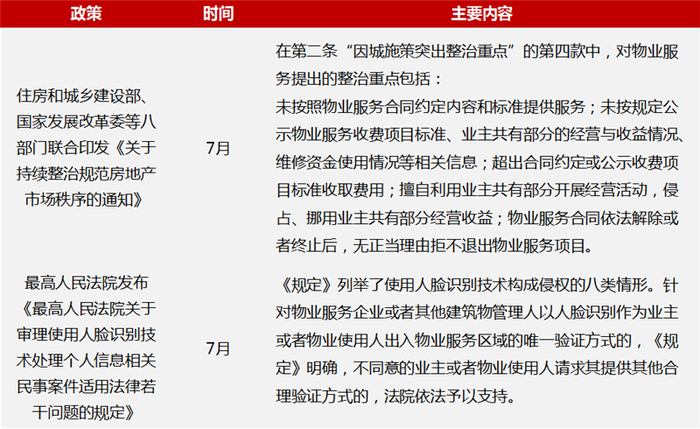 政策层面:近日,八部门联合印发通知规范房地产市场秩序,对物业市场的突出问题也进行了整治和规范;另外,最高法规定了物业服务企业对人脸识别的使用权限。政策对物业市场的监管进一步加强。