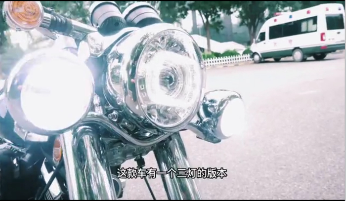 全新设计的LED圆型大灯(ps:总觉得圆灯与复古才是最好的搭配)。启动电门锁,日行导管条常亮,低灯通过透镜射出,光源均匀铺开,照明效果良好。高灯由上下各四粒高亮LED灯珠组成,亮度十足。