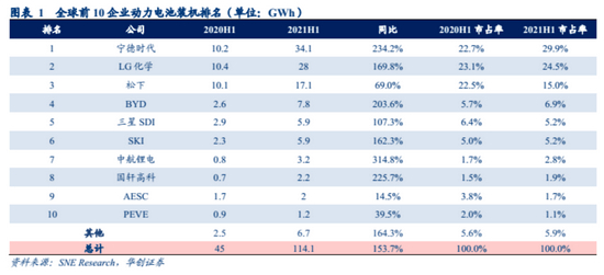 经过3年多的发展,宁德时代的电池市占率不仅碾压比亚迪,而且超越LG成为全球第一。截至2021年上半年,宁德时代电池装机量34.1GWh,同比激增2倍多,市占率29.9%,LG市占率24.5%,松下第三,比亚迪第四,三星SDI第五,中航锂电第7。