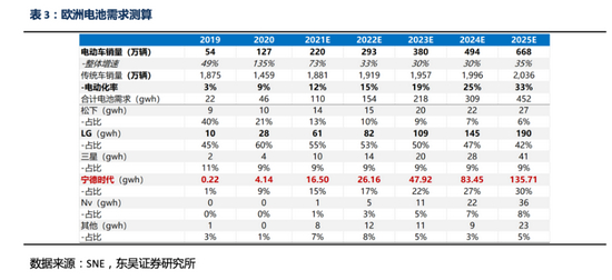 在产能布局上,宁德时代更偏重于中国内地,而LG、松下等则在欧洲、美国布局更深。2025年,LG在欧洲产能布局190GWh,宁德时代为135.71GWh;市场估计到2025年美国市场电池产能将达到100GWH,目前内资尚无布局。