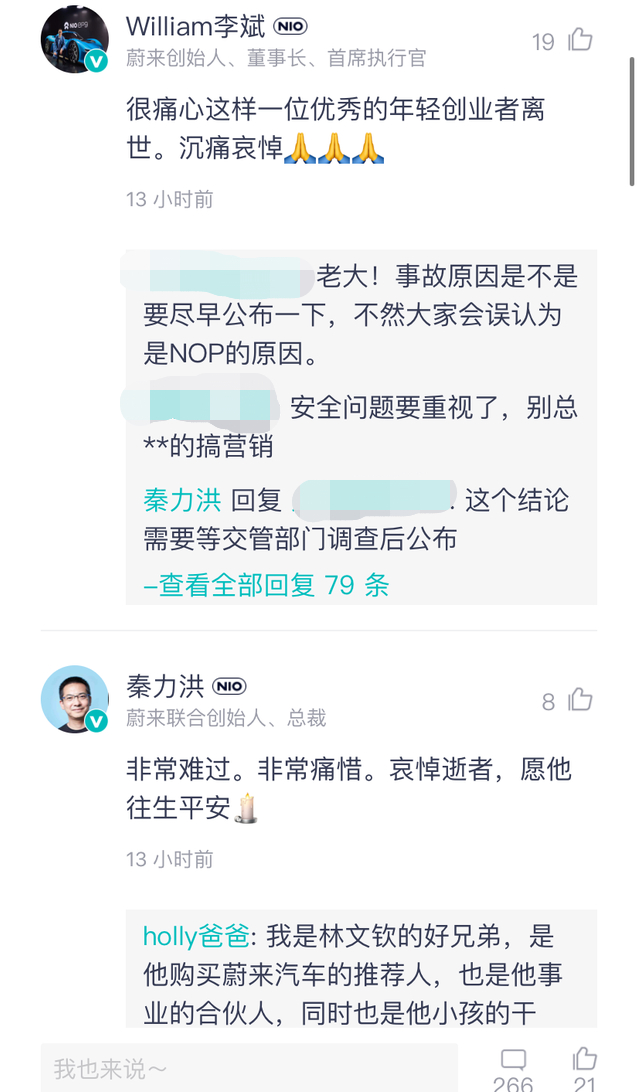 蔚来汽车创始人、董事长兼首席执行官李斌,以及蔚来汽车联合创始人、总裁秦力洪也分别表态称:“这样优秀的年轻创业者离世很痛心,沉痛哀悼。”
