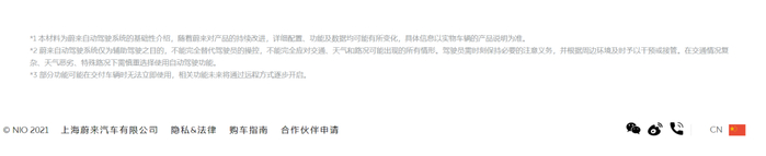 在蔚来的官方网站上,在介绍NAD驾驶系统时,同样用大字写着“蔚来自动驾驶”。需要一直将页面拖至末尾,才有一行浅色的小字写着“蔚来自动驾驶系统仅为辅助驾驶之目的,不能完全替代驾驶员的操控”。