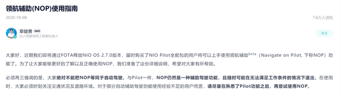 2020年10月,蔚来无人驾驶系统工程部负责人章健勇在蔚来APP上发布《领航辅助(NOP)使用指南》,文中写道:“必须再三强调的是,大家绝对不能把NOP等同于自动驾驶。与Pilot一样,NOP仍然是一种辅助驾驶功能,且随时可能在无法满足工作条件的情况下退出。在使用时,大家必须时刻关注交通状况及道路环境。对于部分自动辅助驾驶功能使用经验不足的用户而言,请尽量在熟悉了Pilot功能之后,再尝试使用NOP。