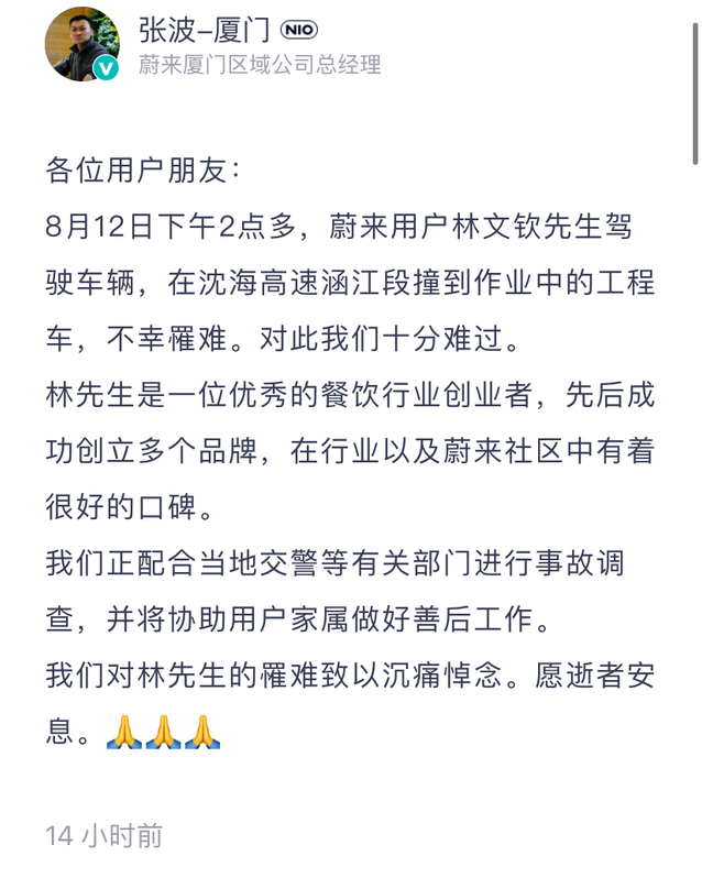 8月14日,自媒体公众号“美一好”发布讣告称,2021年8月12日下午2时,上善若水投资管理公司创始人、意统天下餐饮管理公司创始人、美一好品牌管理公司创始人林文钦先生(昵称“萌剑客”),驾驶蔚来ES8汽车启用自动驾驶功能(NOP领航状态)后,在沈海高速涵江段发生交通事故,不幸逝世,终年31岁。