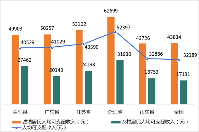 百强县城镇居民人均可支配收入高达4.99万元,虽然比不上广东、江苏、浙江,但远超山东和全国水平。
