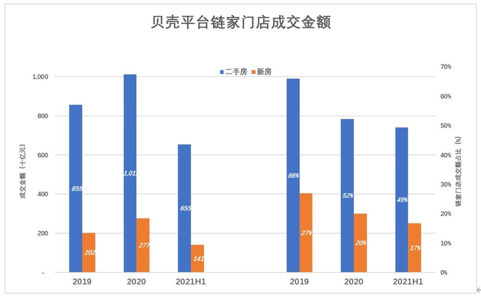 进入2021年,CAN平台二手房成交额中链家门店占比退至50%以下;而新房交易额中,非链家门店早在2020年就占到80%,2021年H1提高到83%。