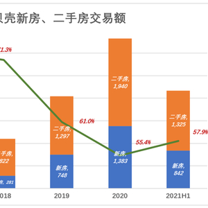 2019年、2020年,新房业务对贝壳营收增长的贡献率均在70%以上。2021年H1,新房业务增长贡献率降至55.9%,但仍显著高于二手房业务的贡献率。