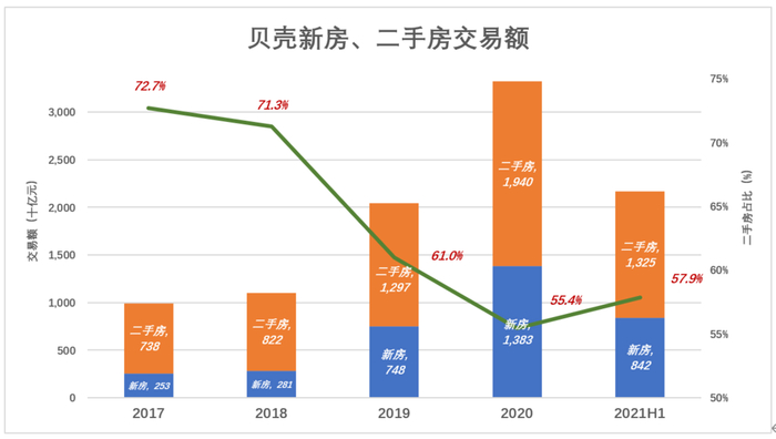 2020年,中国新房、二手房交易额分别为17万亿和7.3万亿,贝壳平台成交的3.3万亿只是零头,成长空间很大。