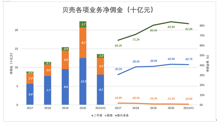 根据2020年数据,二手房、新房、新兴业务三个板块分别贡献了“真实营收”的55.8%、36.6%、7.6%。