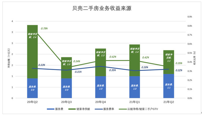贝壳Q2二手房业务营收为96亿,其中85亿是佣金,11亿是向非链家门店收取的服务费,费率为0.32%。