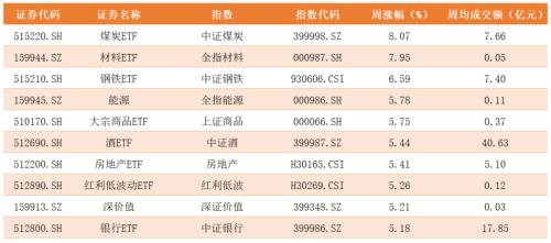 ETF上榜标的主要由两大方向构成,一方面是传统资源板块,代表产品煤炭ETF、材料ETF、钢铁ETF等;另一方面是在低估值三傻的强势上涨带动下,价值派代表地产、红利、银行全面上涨。