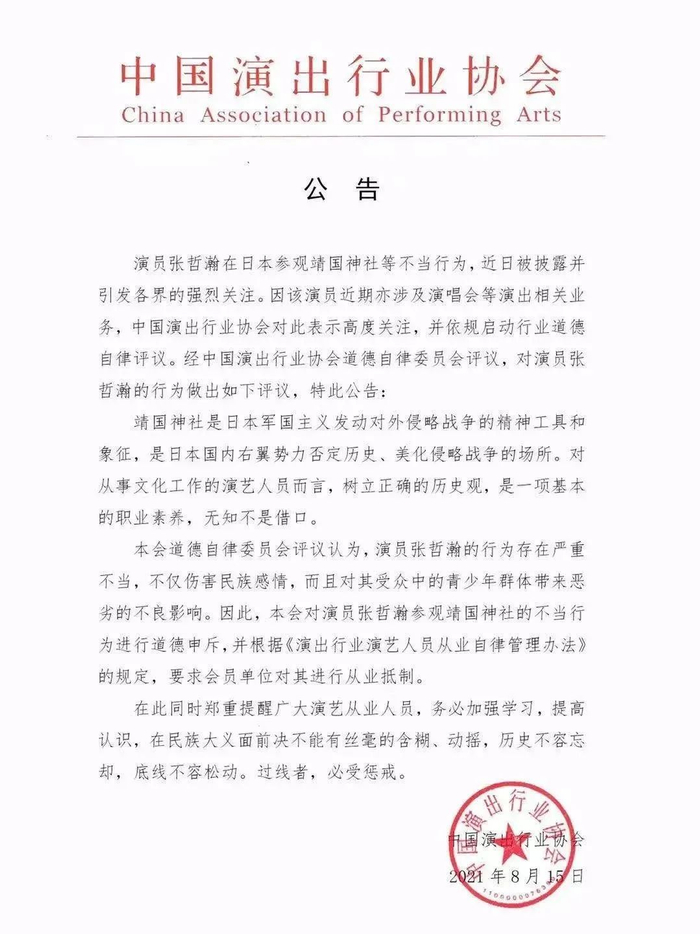 8月15日,@中国演出行业协会 发布公告,要求会员单位对演员张哲瀚进行从业抵制。