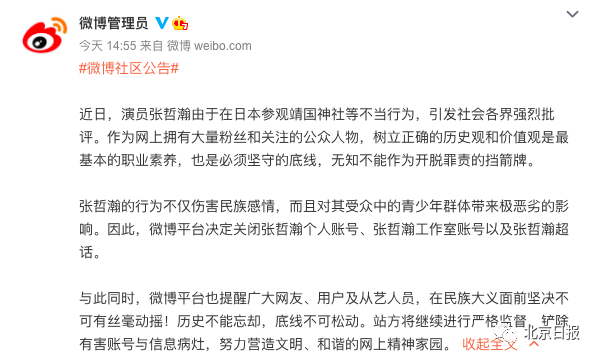 公告称,近日,演员张哲瀚由于在日本参观靖国神社等不当行为,引发社会各界强烈批评。张哲瀚的行为不仅伤害民族感情,而且对其受众中的青少年群体带来极恶劣的影响。因此,微博平台决定关闭张哲瀚个人账号、张哲瀚工作室账号以及张哲瀚超话。
