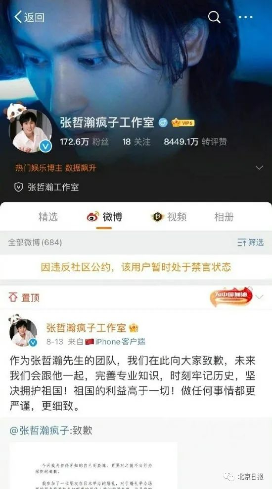 被曝参观日本靖国神社等不当行为后,艺人张哲瀚8月13日发文道歉,随后被20多个代言品牌宣布解约。8月14日,有网友发现,张哲瀚的个人微博及工作室微博处于禁言状态,相关话题迅速冲上热搜。