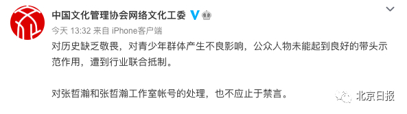 8月15日下午,@中国文化管理协会网络文化工委 就张哲瀚事件发声,称其对历史缺乏敬畏、对青少年群体产生不良影响,公众人物未能起到良好的带头示范作用,遭到行业联合抵制。对张哲瀚和张哲瀚工作室的处理,也不应止于禁言。