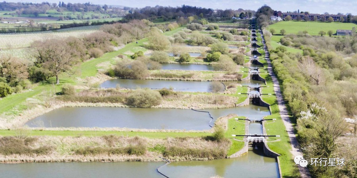 而在一些水位落差较大的河段,密集排列的船闸更是构成了蔚为壮观的船闸阶梯(lock flight),其中最为惊艳的当属位于Kennet&Avon运河上的Caen Hill Lock Flight。在这一段长度为3.2公里的河道上,29座船闸将水平面整整抬高了72米,其位于中段的16个船闸更是犹如一列整齐的标兵,层叠铺展在悠长的斜坡之上。