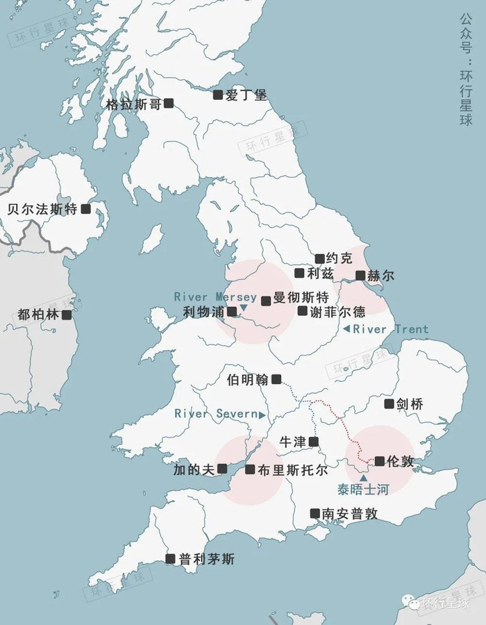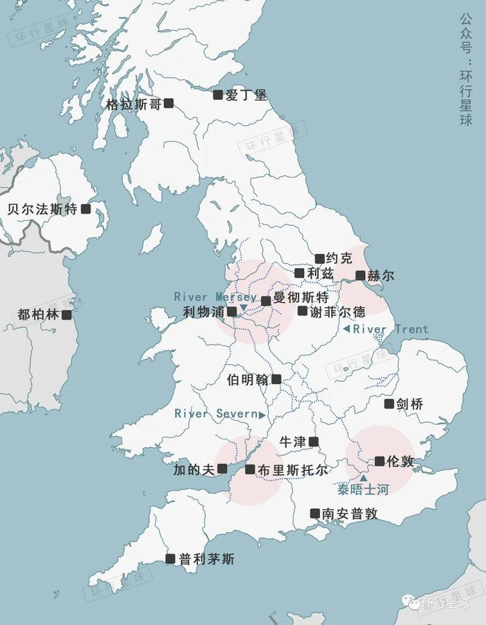 该运河网主要由四道主干运河构成,将英格兰境内的四大天然河流连接在一起,纵横阡陌,一举勾连起英格兰的四方港口(西北:River Mersey——利物浦;东北:River Trent——赫尔;西南:River Severn——布里斯托;东南:泰晤士河——伦敦)。至此,英格兰的“四肢”已然“经络相连”。