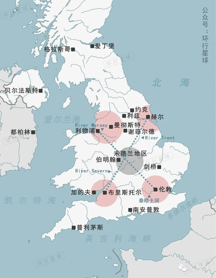 位居英国中部腹地的米德兰地区(Midland)有着丰富的煤铁资源,是非常重要的潜在能源产地和制造业重镇(其地区中心伯明翰更是如今的英国第二大城市),在工业革命中拥有难得的区位优势。