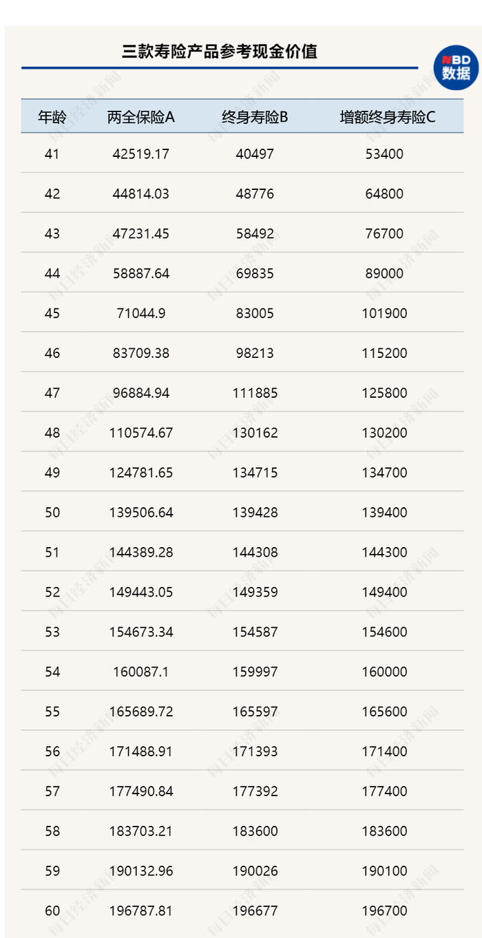 《每日经济新闻》记者选取目前市面上畅销的三款不同类型寿险产品,即两全保险A、传统终身寿险B、增额终身寿险C,比对其现金价值发现,相较于其他寿险产品,增额终身寿险C现金价值在交费后5~7年高增长的特征尤为明显。