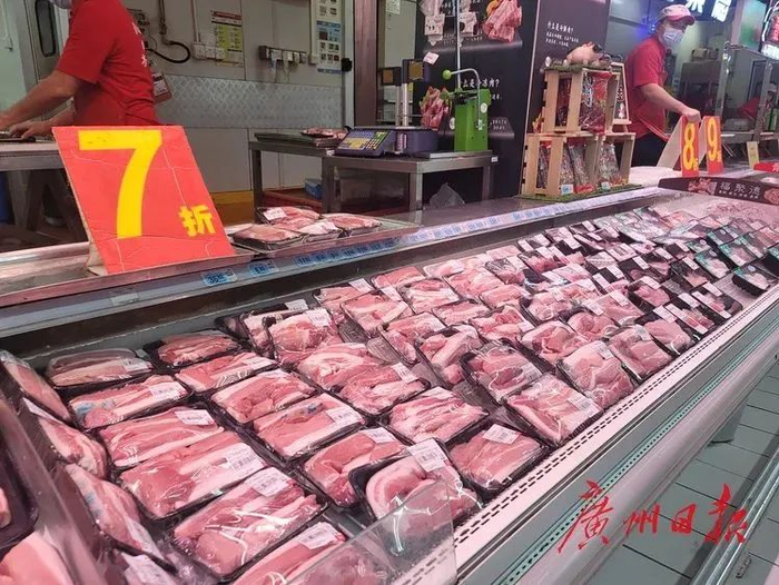 在肉品区,记者看到不少顾客正在挑选瘦肉、猪排、肉馅等生鲜猪肉产品,工作人员表示目前是打折时间,全场猪肉7-9折。