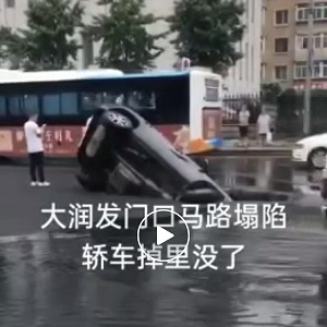 该条视频显示,在有积水的马路上,人来人往,车来车去,一辆轿车斜插在马路中央,随着一声“我的妈呀”,路面进一步塌陷,轿车掉入其中。就在一些市民围观拍照时,塌陷范围扩大,坑边一辆自行车也掉入其中。