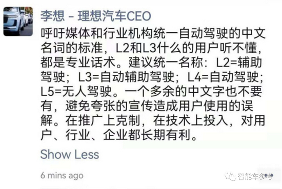 理想汽车创始人李想倡议:是时候统一自动驾驶的中文名词标准,别L2、L3之类的专业术语了,避免宣传上的夸张和用户误解,对企业也长期有利。