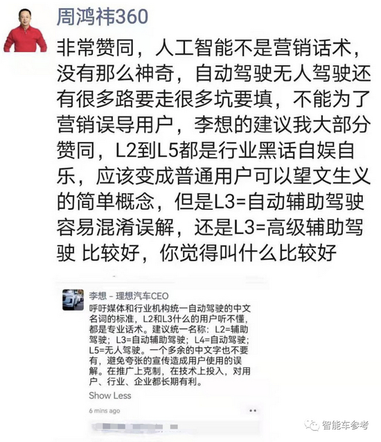 不过,在具体到李想倡议的“L3=自动辅助驾驶”,周鸿祎不认同,他觉得容易混淆和误解。