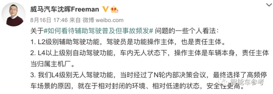 威马汽车创始人沈晖,还展开了一波辅助驾驶和自动驾驶责任主体的看法抒发。