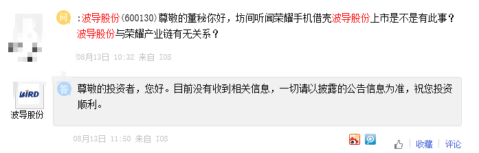 8月13日上午,有投资者在上证e互动向波导股份提问称:“坊间听闻荣耀手机借壳波导股份上市是不是有此事?”