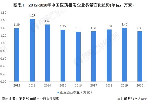 在医药批发环节,近年来,我国医药批发企业总量变化较为平稳,截至到2020年底,全国医药批发企业数量为1.31万家。