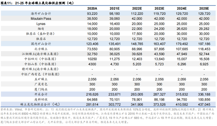 1)我们测算2020-2025年全球氧化镨钕需求增速CAGR约10%。预计2021-2023年轻稀土镨钕需求量为7.2/7.7/8.4万吨,供需缺口分别为-0.79/-0.51/-0.47万吨,主要靠消化库存来满足需求。考虑到包钢积累的大量轻稀土尾矿库,未来镨钕供给弹性相对充足;