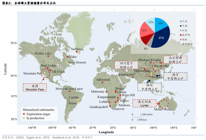 全球稀土资源储量较为集中,开采进入多元供给格局。从资源储量角度看,根据20年USGS统计数据,全球稀土资源总量为1.2亿吨,其中中国4400万吨,占比达到37%;越南和巴西探明储量分别为2200,2100万吨,合计占比35.8%;俄罗斯探明储量1200万吨,占比10%;印度探明储量690万吨,占比约6%,资源储量分布较为集中,全球前五国家储量占比近90%,但中重稀土主要存在于中国和缅甸。另一方面,国内稀土储量分布亦高度集中,呈现北轻南重格局。其中北方轻稀土矿以包头白云鄂博、四川冕宁、山东微山的氟碳铈矿为主;南方重稀土矿以江西、广东等地区的离子型矿为主。