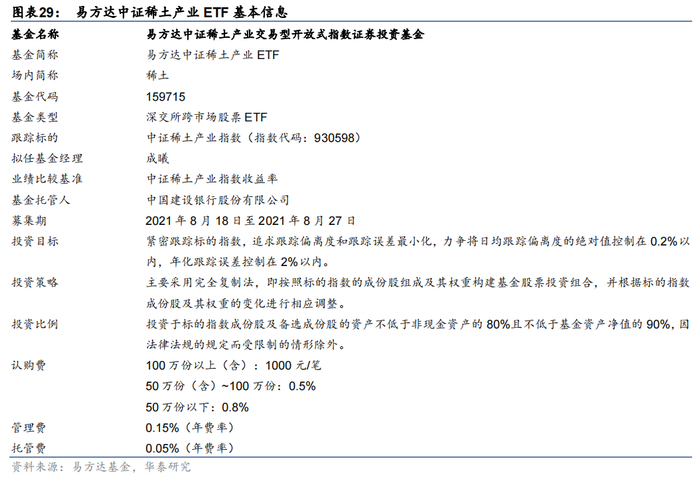 易方达中证稀土产业ETF(基金代码:159715)跟踪中证稀土产业指数,是投资稀土产业的重要工具化产品。该基金场内简称稀土,基金管理人为易方达基金,拟任基金经理为成曦先生,管理费和托管费分别为0.15%和0.05%,属于同类型基金中最低水平。易方达中证稀土产业ETF募集期为2021年8月18日至2021年8月27日。