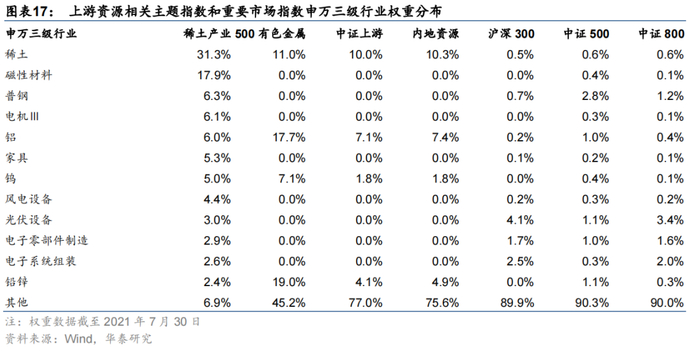 对比稀土产业与其他上游资源相关主题指数及重要市场指数申万三级行业权重分布。如下表所示。稀土产业指数相比其他三个相关主题指数显著高配稀土、磁性材料、普钢、电机Ⅲ等,低配铝、铅锌。