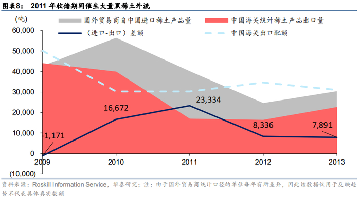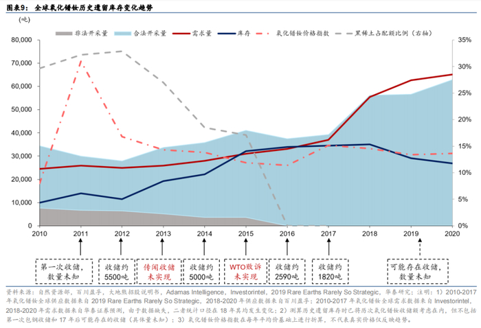 2012-16年供给端结构性改革,逐步解决历史遗留库存问题。1)环保普查常态化,稀土产品建立追溯体系,打黑手段不断更新强化,黑稀土得到有效遏制;2)稀土行业完成整合,矿山和冶炼收归六大集团,国家配额限产并逐步淘汰落后产能;3)收储方式由商储转为国储,采取“少量多次”方略,加速库存去化;4)开发新材料研发和产业化专项项目等,扩展下游需求,特别是新能源汽车的快速发展形成了显著新增需求。这些政策在淘汰落后产能、打击违法违规行为、优化产业结构、提升下游应用水平和绿色生产水平等方面取得了积极进展,历史遗留库存不断被消耗。