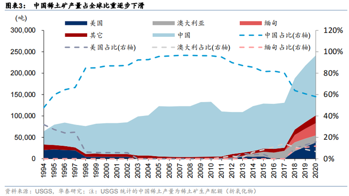 从稀土矿开采角度看,全球供应格局变化明显:1)国内由于供需错配开始不断提高稀土矿产量配额,据国家自然资源部,16-20年稀土矿指标从10.5万吨增加到14万吨,4年CAGR达7.5%,21年公布的第一批配额为8.4万吨,同比增长27%;2)海外之前主要依靠中国供应稀土矿,2018年开始强化对自有矿山轻稀土资源的开采,轻稀土产量贡献占比逐渐提高。据USGS数据,中国2020年配额产量占全球总供应量58%,产量配额虽继续增长,但较2017年80%的占比出现显著下降,稀土矿开采格局出现比较明显的变化。