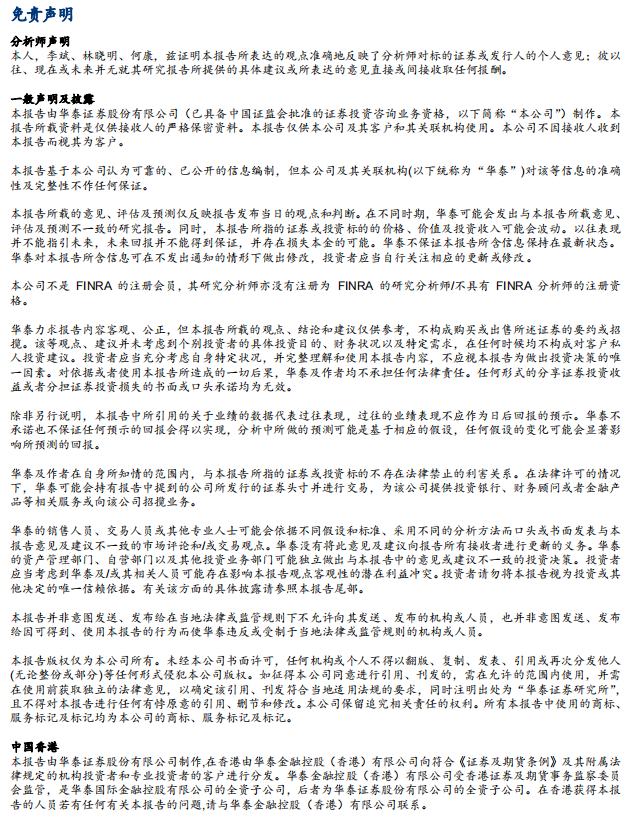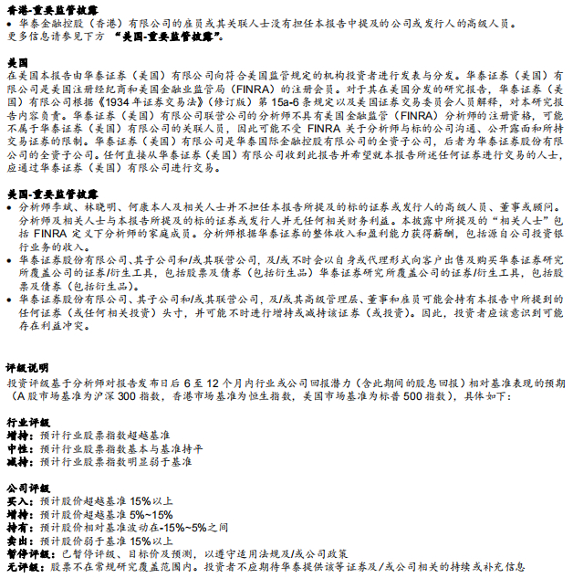 在任何情况下,本公众号中的信息或所表述的意见均不构成对客户私人投资建议。订阅人不应单独依靠本订阅号中的信息而取代自身独立的判断,应自主做出投资决策并自行承担投资风险。普通投资者若使用本资料,有可能会因缺乏解读服务而对内容产生理解上的歧义,进而造成投资损失。对依据或者使用本公众号内容所造成的一切后果,华泰证券及作者均不承担任何法律责任。