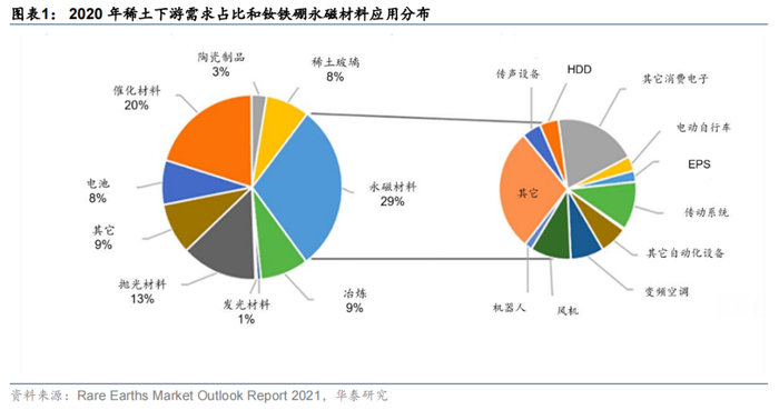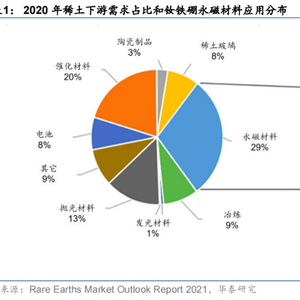 稀土的终端应用范围广泛,从用途看,稀土下游需求最大的是永磁材料(2020年全球占比近29%),而钕铁硼则是迄今为止综合素质最优第三代稀土永磁体,其中中低端钕铁硼多用于箱包扣、门扣、玩具、磁选等领域,而高性能钕铁硼由于性能优异,被广泛应用于汽车、风电、智能制造等众多新兴产业中。从2018年数据来看,我国高性能钕铁硼需求主要集中在汽车领域,其中传统汽车占比38%,而新能源车占比接近12%,风电、消费电子、变频空调、节能电器领域,占比均在8%-10%区间。未来,随着新能源汽车的发展,新能源汽车电机的磁材需求将成为高性能钕铁硼永磁材料需求的主要增长点,钕铁硼永磁材料的需求增长也将大幅拉动轻稀土中镨钕,中重稀土中镝铽的需求。