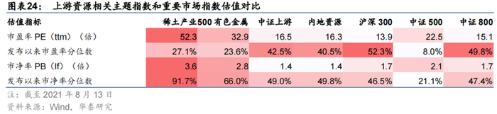 横向考察2021年8月13日稀土产业相关主题指数和重要市场指数的估值指标以及各指数发布以来分位数,如下表所示。稀土产业指数市盈率和市净率高于其余可比相关主题指数与重要市场指数。
